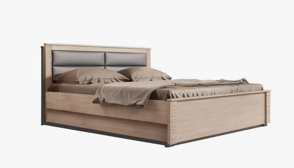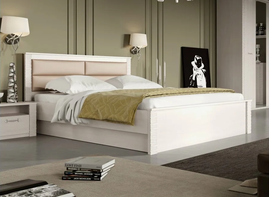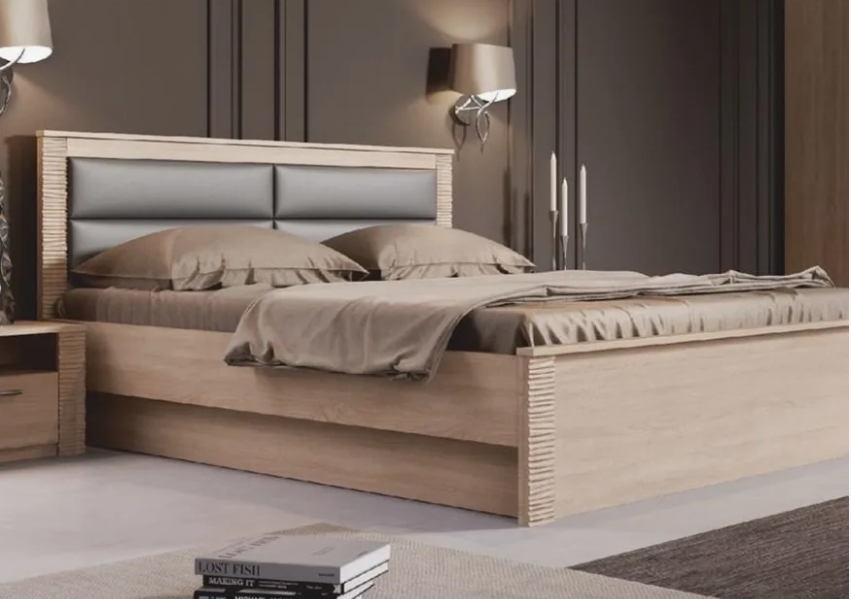 Кровать оснащена мягким изголовьем, состоящим из четырёх элементов, обтянутых экокожей.