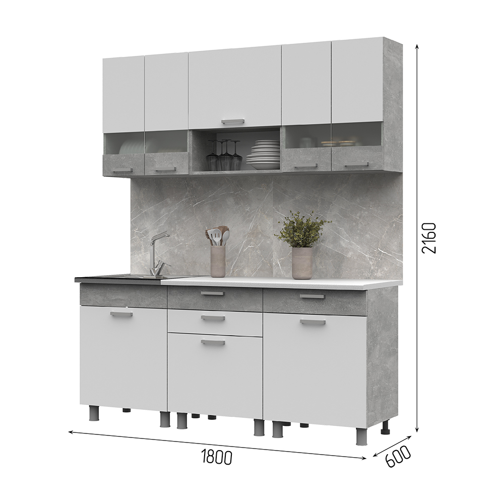 Габаритные размеры нижних модулей: ШхВхГ 1800 х 842 х 600 мм.