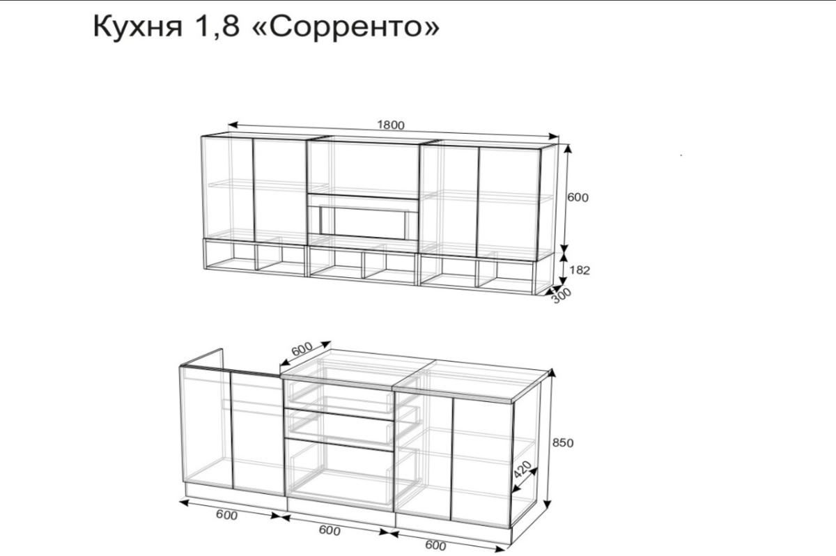 - Высота верхних модулей 782 мм (600 мм шкафчики + 182 мм открытая ниша).