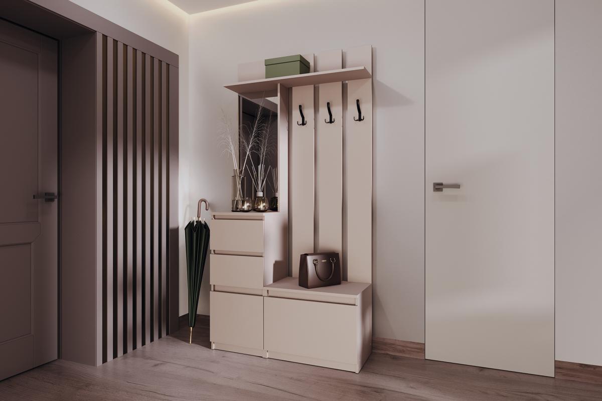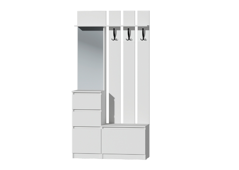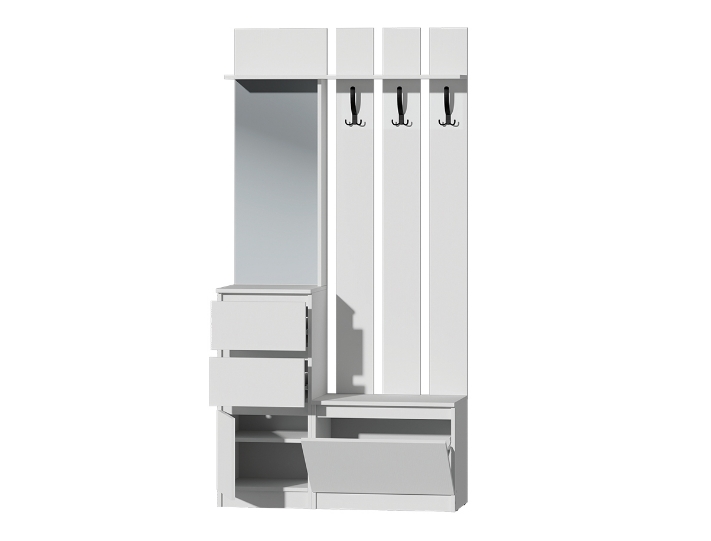 - У данной прихожей 2 выдвижных ящика, 1 распашная и 1 откидная створка, отдел с крючками для верхней одежды.