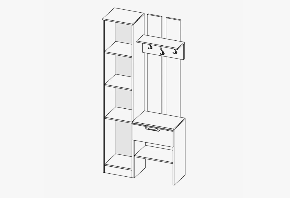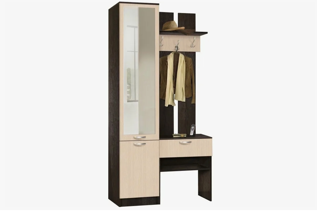Прихожая имеет простой дизайн и прямые формы, включает пенал с зеркалом с тремя просторными полками и вешалку с тремя трёхрожковыми крючками для одежды, антресольной полкой для головных уборов, выдвижным ящиком и открытой нишей.