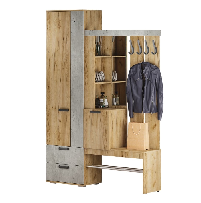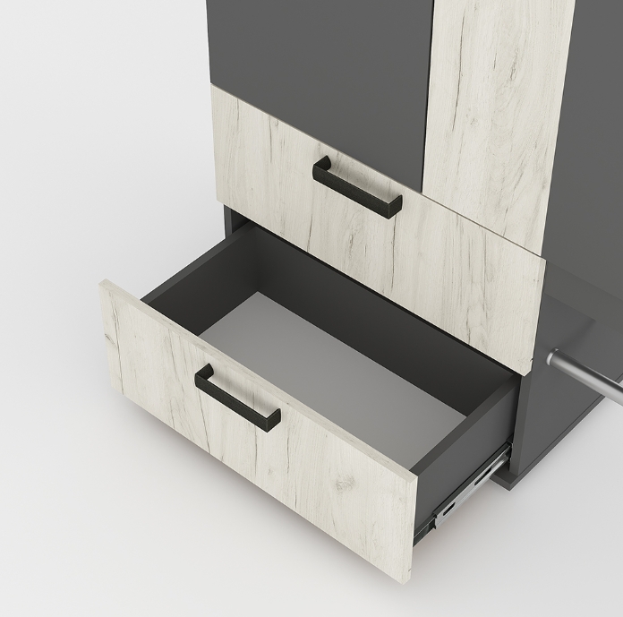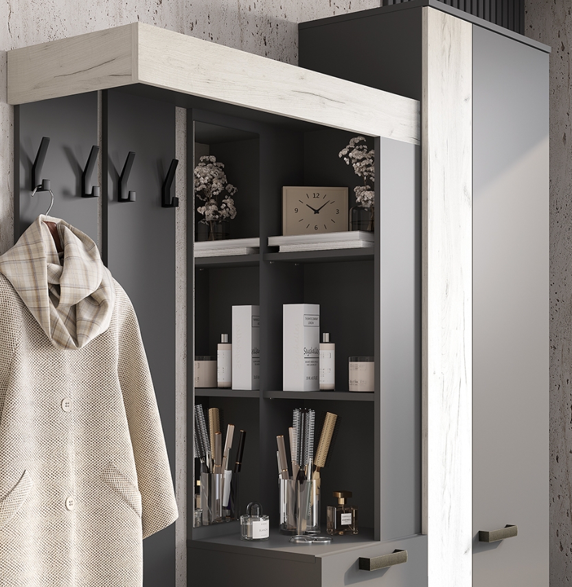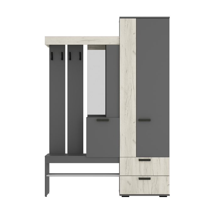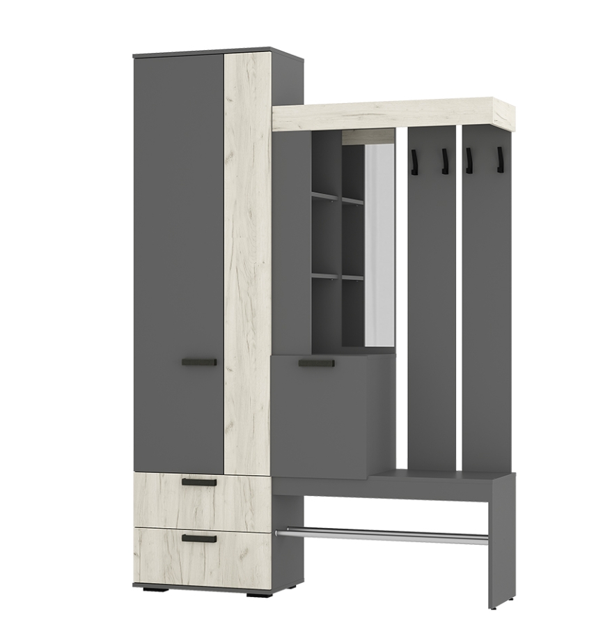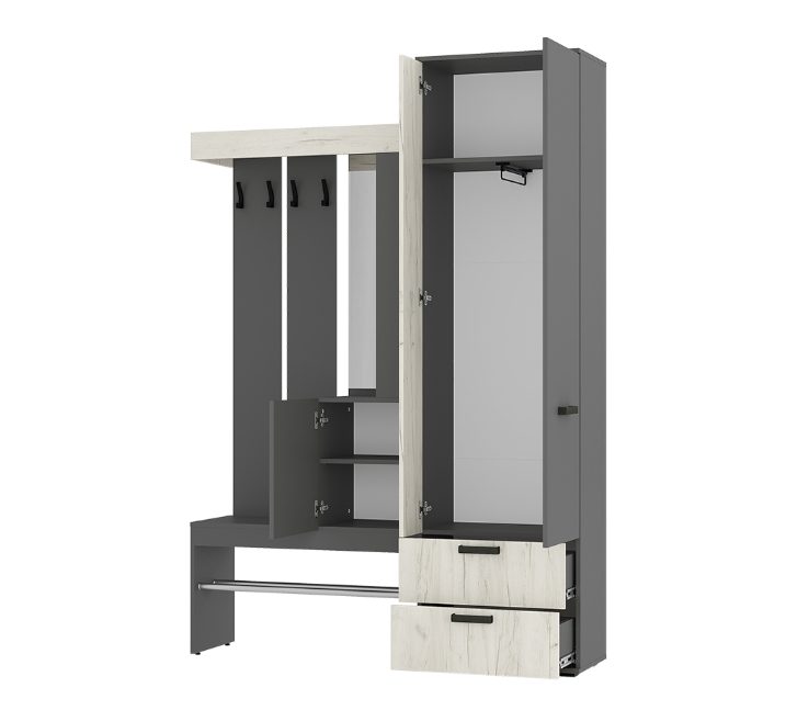 Изящная и практичная конструкция. Вместительный и компактный шкаф с отделением для верхней одежды и выдвижными ящиками. Удобная подставка под обувь (металлическая труба). Эргономичная основная секция с крючками для одежды, полками для мелочей, зеркалом и одним закрытым отделением. Контрастное исполнение в трендовых оттенках.