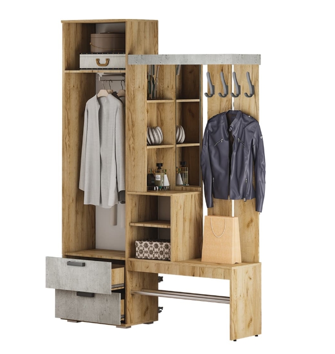 Идеальный выбор для современного интерьера, особенно в стиле "лофт", – это прихожая "Трамп". Модель выполнена из ЛДСП двух цветов – "крафт" и "бетон", изделие имеет все необходимые зоны для размещения вещей в прихожей: крючки для верхней одежды, открытые и закрытые ниши, шкаф с выдвижной штангой и зону для хранения обуви