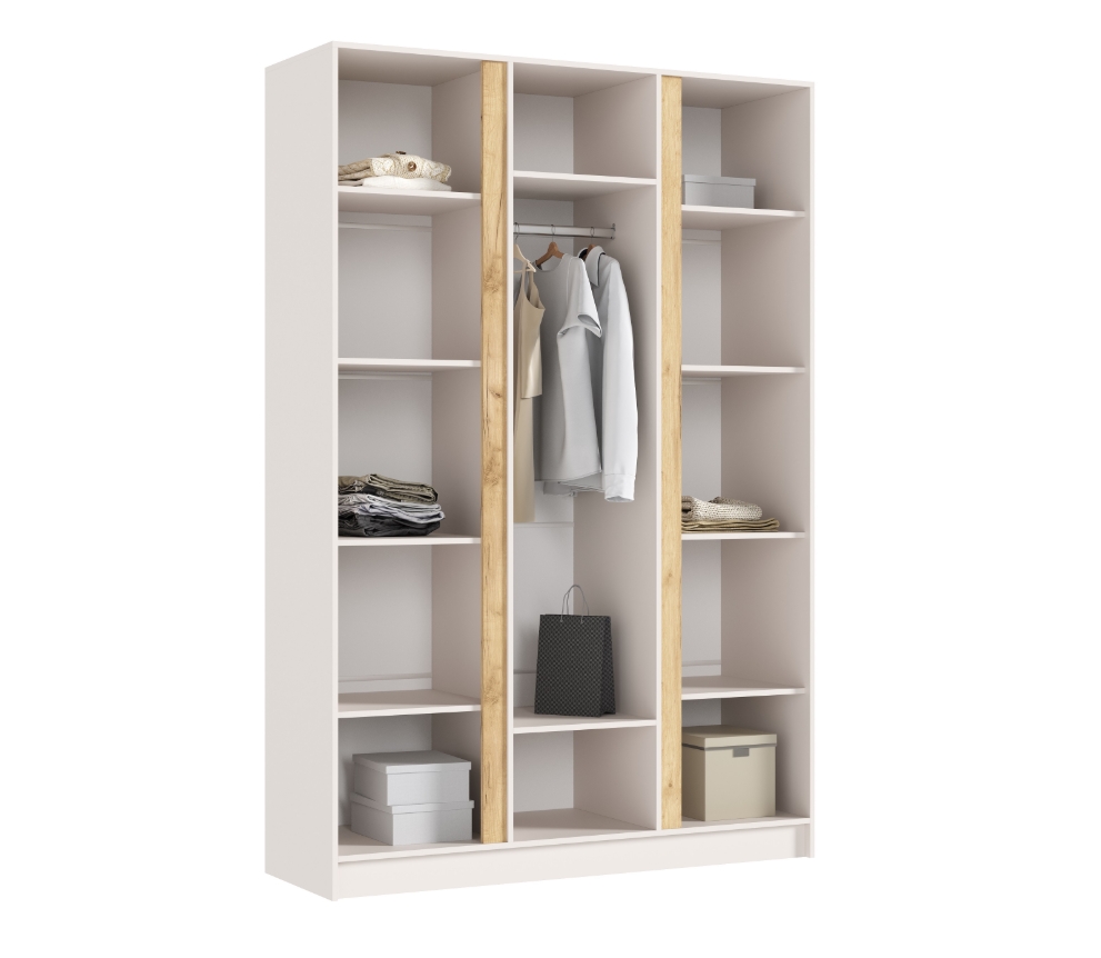 В комплектацию шкафа на первом фото входит: полки,вязка (полка), штанга для одежды, детали,схема сборки,фурнитура.