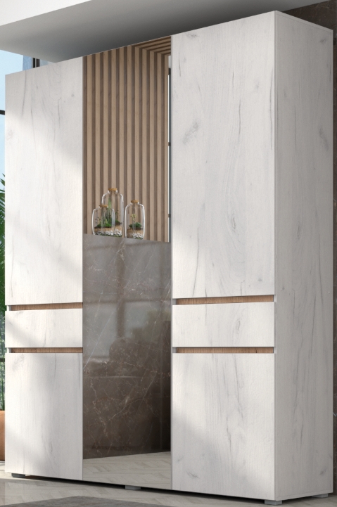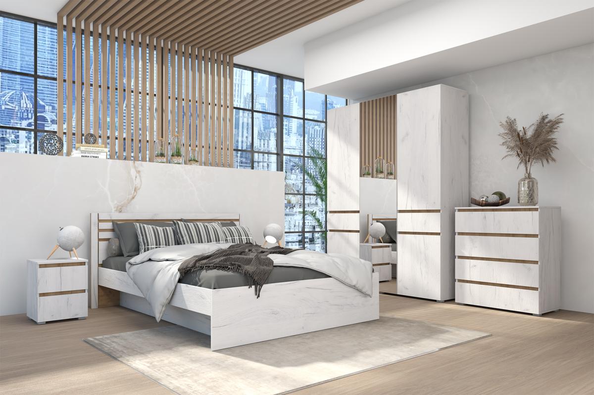 Спальня «Лиана» Цвета: Крафт белый/графит Крафт белый/крафт золото Описание Как купить Шкаф 3-х створчатый Ширина 1600 Высота 2200 Глубина 520 Комод Ширина 800 Высота 958 Глубина 471 Тумба прикроватная Ширина 402 Высота 498 Глубина 353 Кровать Ширина 1562/1762 Высота 900 Длина 2048