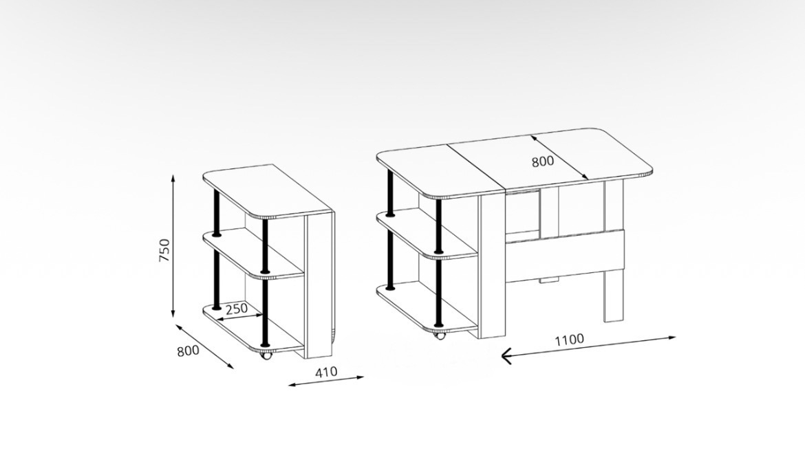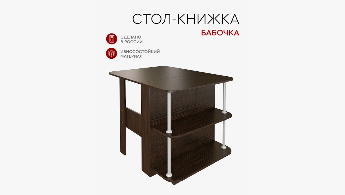 Стол-книжка Бабочка – красивый прямоугольный современный стол -тумба, с одной стороны которого размещены полочки, а с другой раскладное крыло.