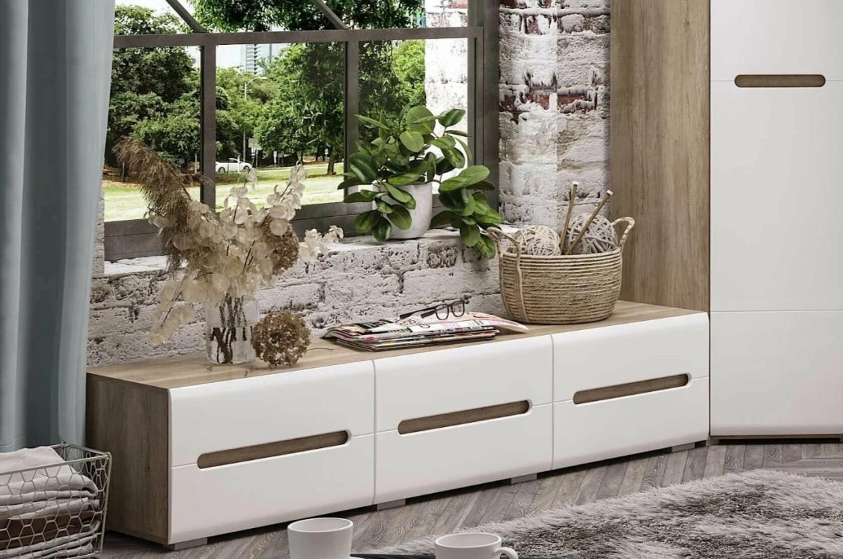 Тумба под ТВ «Наоми» Основной цвет: дуб каньон-белый глянец Размер 1802х460х408 ШхДхВ Материал корпуса ЛДСП Материал фасада МДФ Описание Как купить